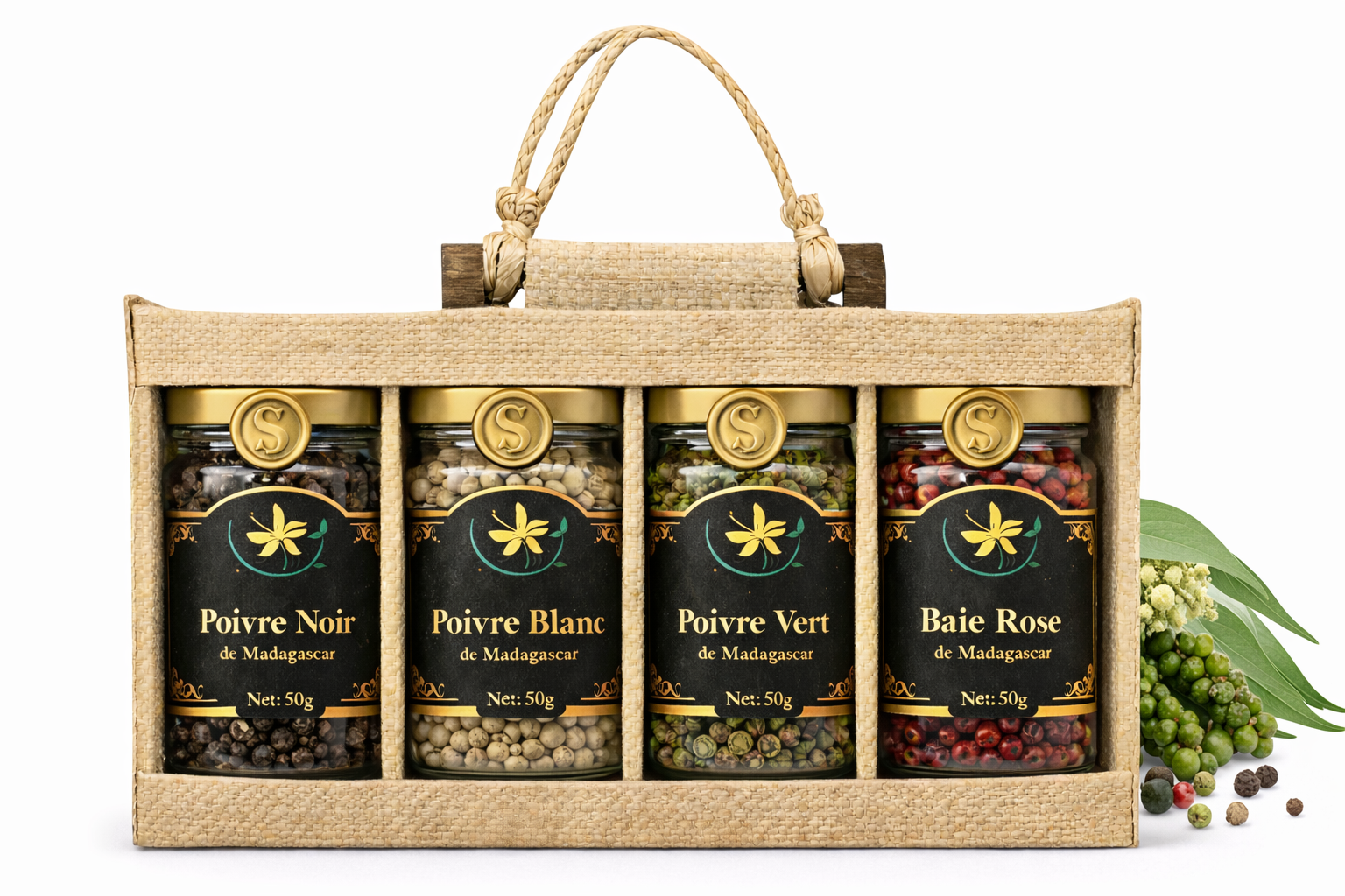 Ce coffret d’exception rassemble quatre variétés emblématiques de poivres et baies aromatiques, soigneusement sélectionnées pour révéler toute la richesse des saveurs de Madagascar.